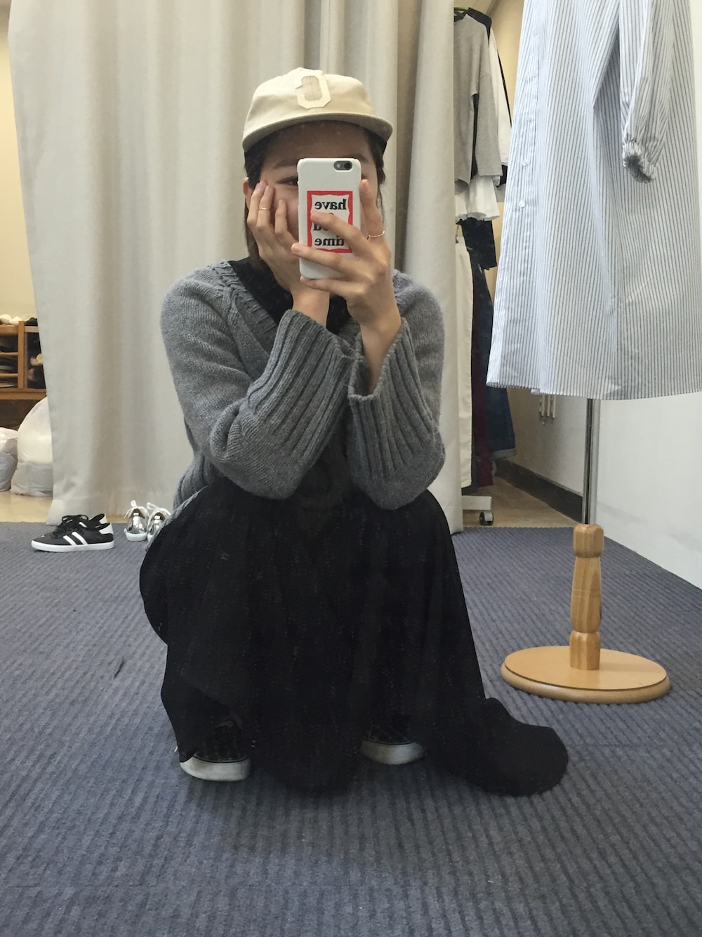 グリーン系のスニーカー、ベージュ系のキャップを着用したレディースの冬コーディネートの1枚目の写真
