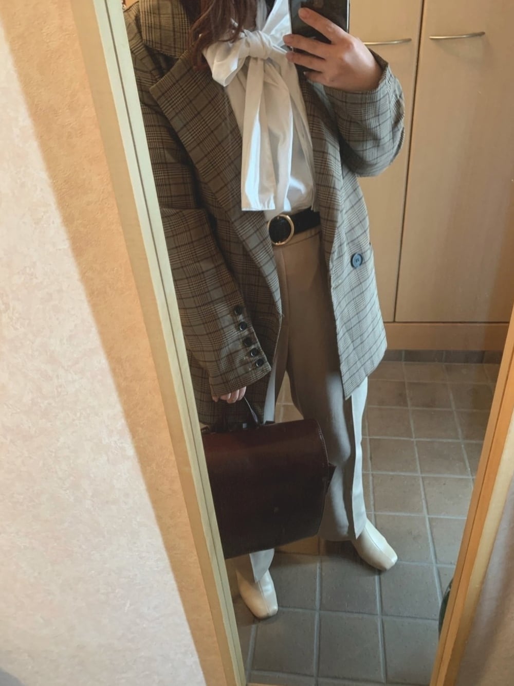 roofのセットアップ「レディース グレンチェック柄ミディジャケット+パンツ セットアップ上下2点セット」を使ったコーディネート