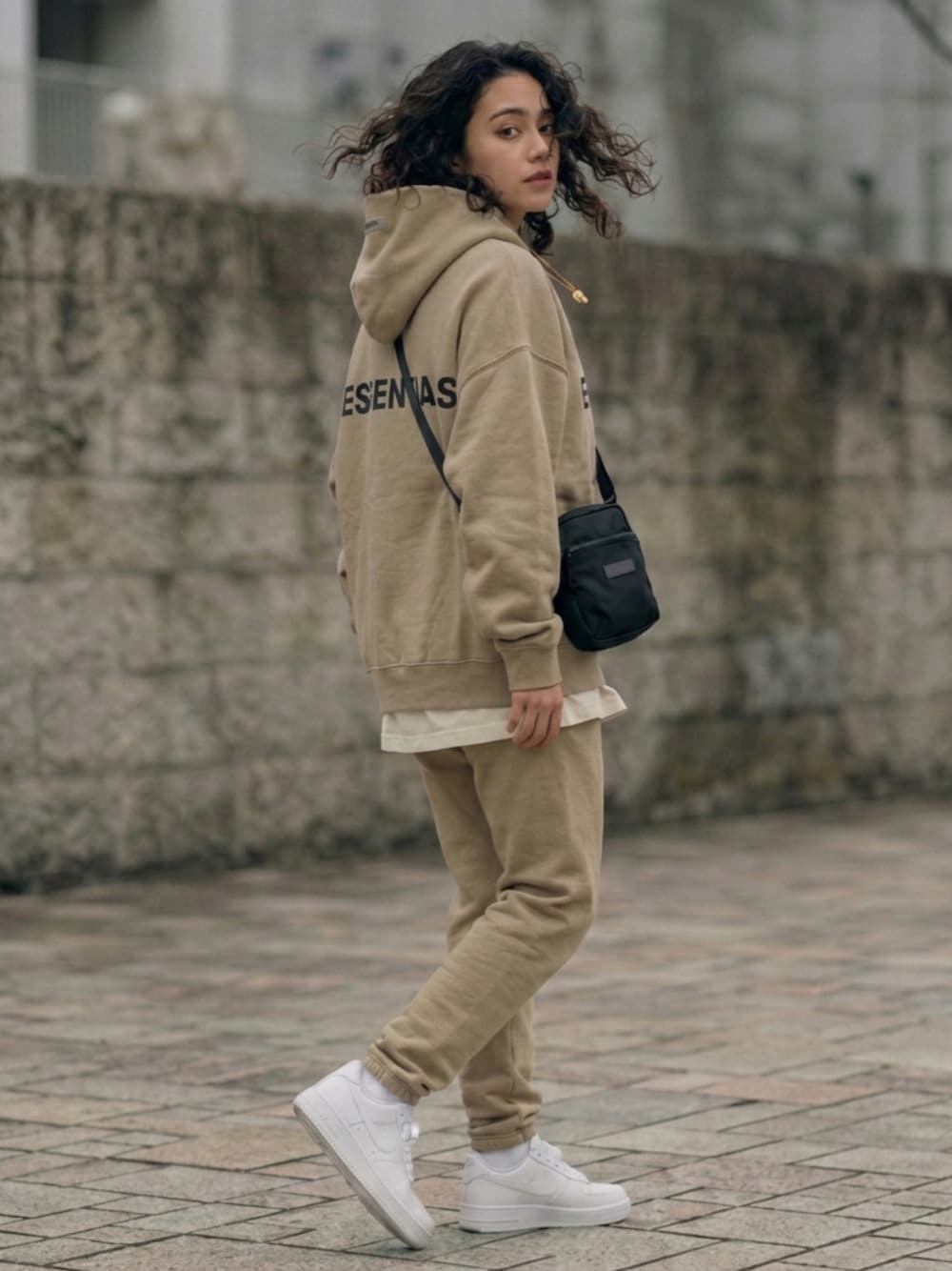 ベージュのフーディとスウェットパンツを使ったセットアップコーデ インナーにはナチュラルカラーのロンTと、足元にはホワイトのAIR FORCE 1で統一感のあるスタイリングです。