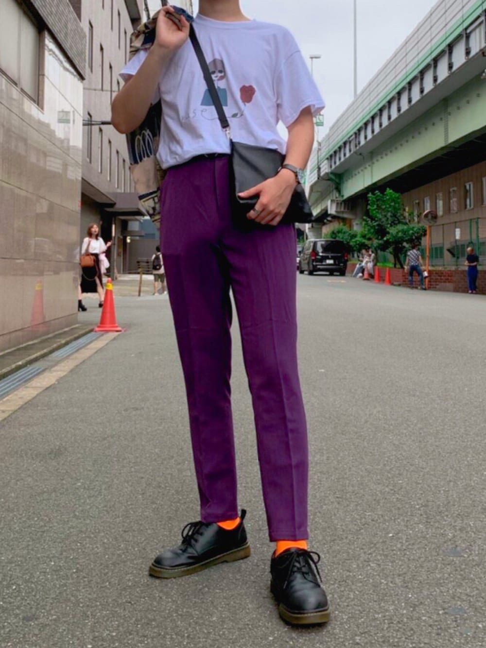 白ティーと紫色パンツの組み合わせ🙌 白ティーはIRUSEさんので、以前投稿したのですがお店の名前も書いてありとても可愛らしいオリジナルデザインです😊 紫パンツはずっと探していてkutir さんをいいなぁって思っていたところmonomartさんで見つけ購入しました! 紫はめちゃめちゃおしゃれに見える色だと思っていて今年の夏は個人的には1番のトレンドです🤩 柄シャツもIRUSEさんのでめちゃめちゃ可愛いので今度柄シャツを着ているバージョンも投稿します🙆♂️