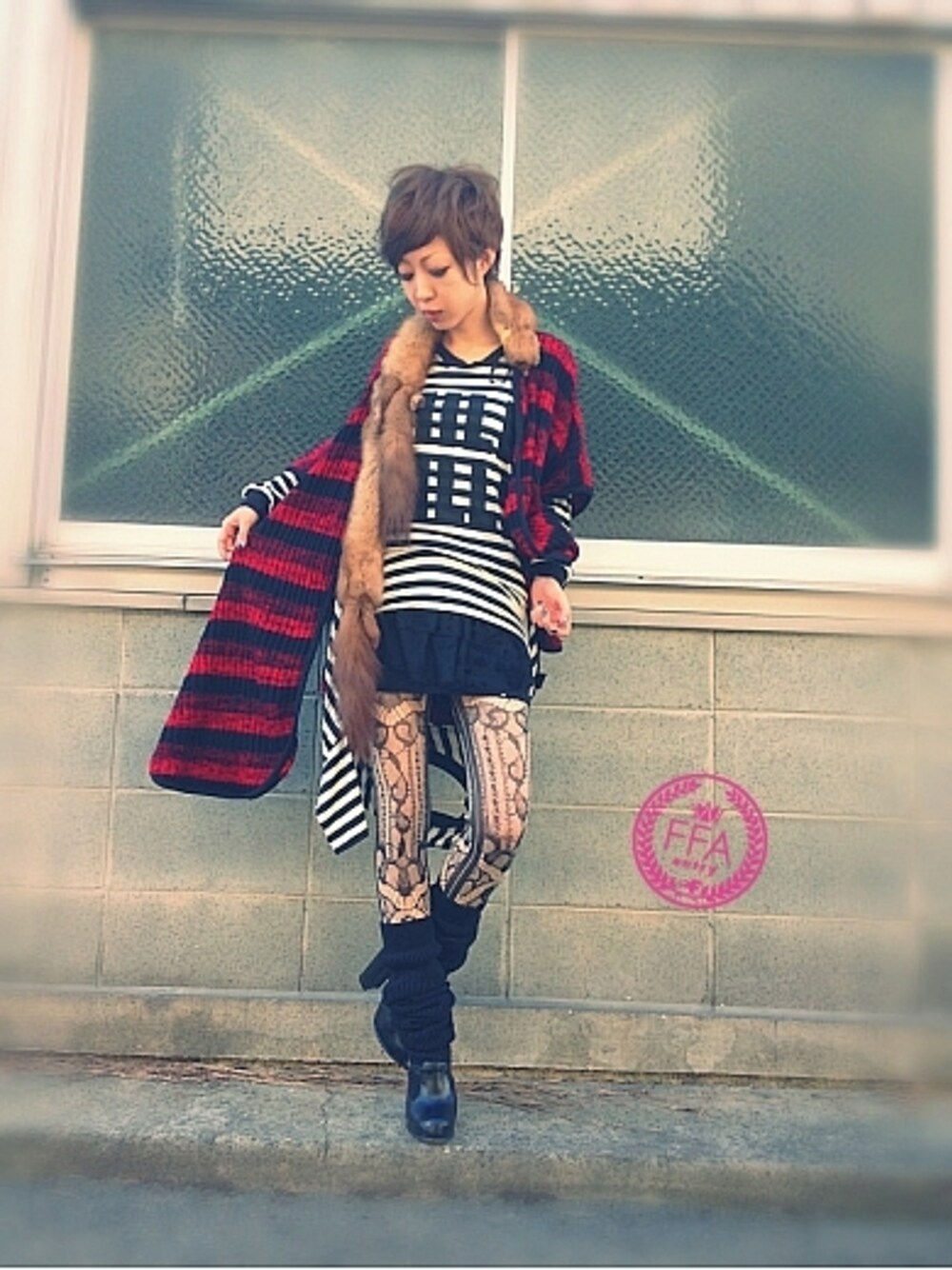 2012.11.17 ガチで今 着たい服ばっかり合わせてみました。 そんなことよりFUKULOG 3周年なんですね。おめでとうございます。 わたしがFUKULOGに参加したのは、ちょうど1年前の今頃でした。 「2012年のリアル」について考えていて、1年前のFUKULOGの自分の投稿を見直してみたんですけど なんかあんまり今と変わってませんでした。 あいかわらず赤×黒が だいすきやし、謎なタイツも、変わった靴も、ふわふわファーもだいすき。 2012年はわたしにとって人生の分岐点でした。変わりました。仕事も、環境も、家庭も。 でも好きなものって、いつまでも変わらへんのかもしれません。 2013年も2014年もたぶんこんな格好してると思いますが、これからもよろしくおねがいします。 あっ、でも1つ裏技を習得しました! 黒の占める面積が多いですが、チュール、カットソー、ニット、パテント、、って全部 違う素材で合わせてます。 かしこいでしょー上級者っぽいでしょー! ただ、前髪を斜めに なでつけ過ぎたのが残念なポイントです。