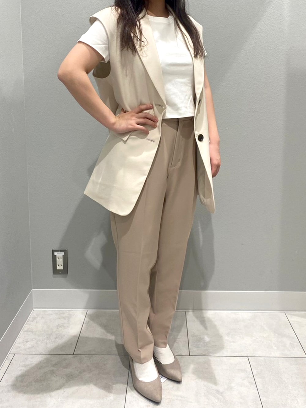 テーマは22歳の大人コーデ ワントーンでベストとパンツで ホワイトとベージュが大人の印象 低身長に見えないIラインを意識 春から夏にかけて使えるベストはオススメ