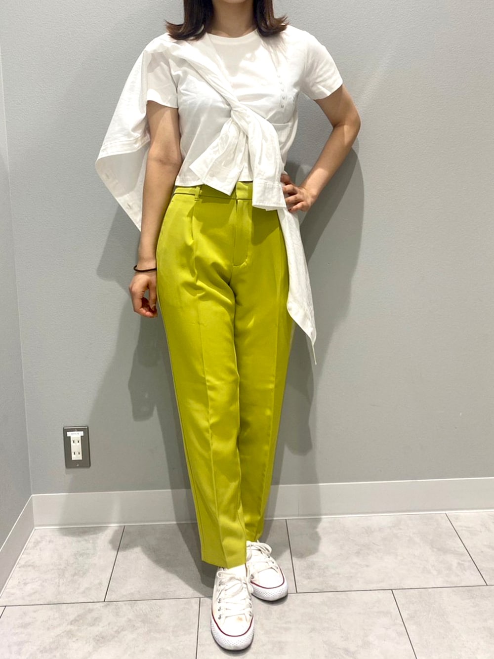 初夏に向けたカジュアル大人コーデ 暑さを調節できるシャツが活躍 カラーパンツで垢抜け効果 スニーカーだけどカジュアルになりすぎないところがポイント