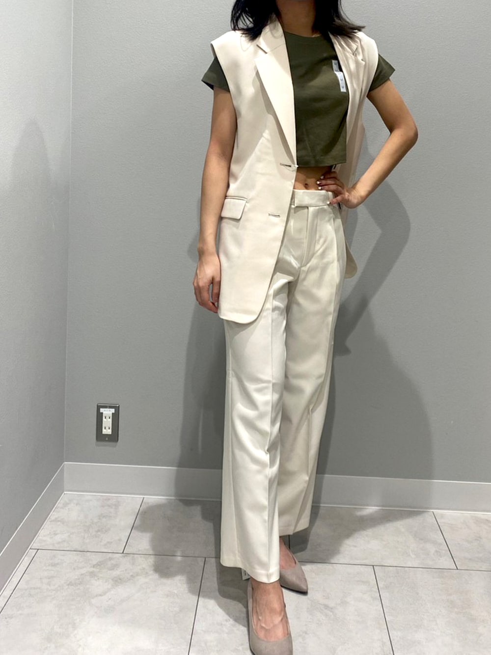 スタイルアップのホワイトコーデ カーキのミニTシャツでヘルシーに肌見せ パンツはセンターラインで大人めに テーマは仕事ができる女子