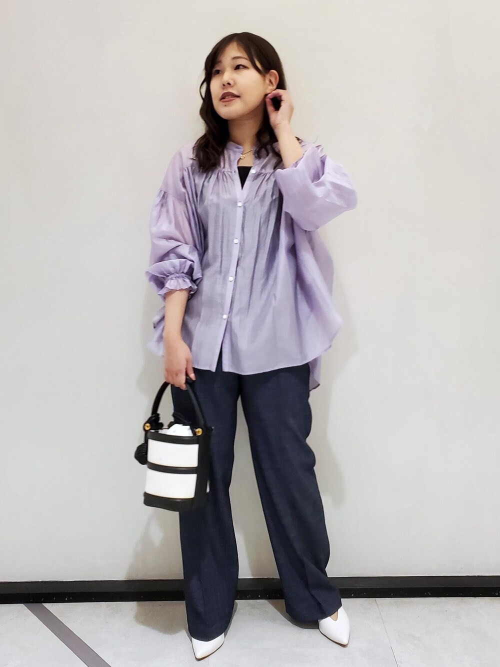 上品な光沢感と透け感のある カラーブラウスは1枚で コーディネート全体を華やかな印象に◎ 艶感が綺麗なブラウスなので、 かちっとしすぎないように デニム風パンツとキャンバス生地の 鞄を合わせ、気取りすぎないお出かけ スタイルにしてみました。 キャミソール 問い合わせ番号→GGF24000 カラー→黒 サイズ→Fサイズ ※靴はスタッフ私物です。