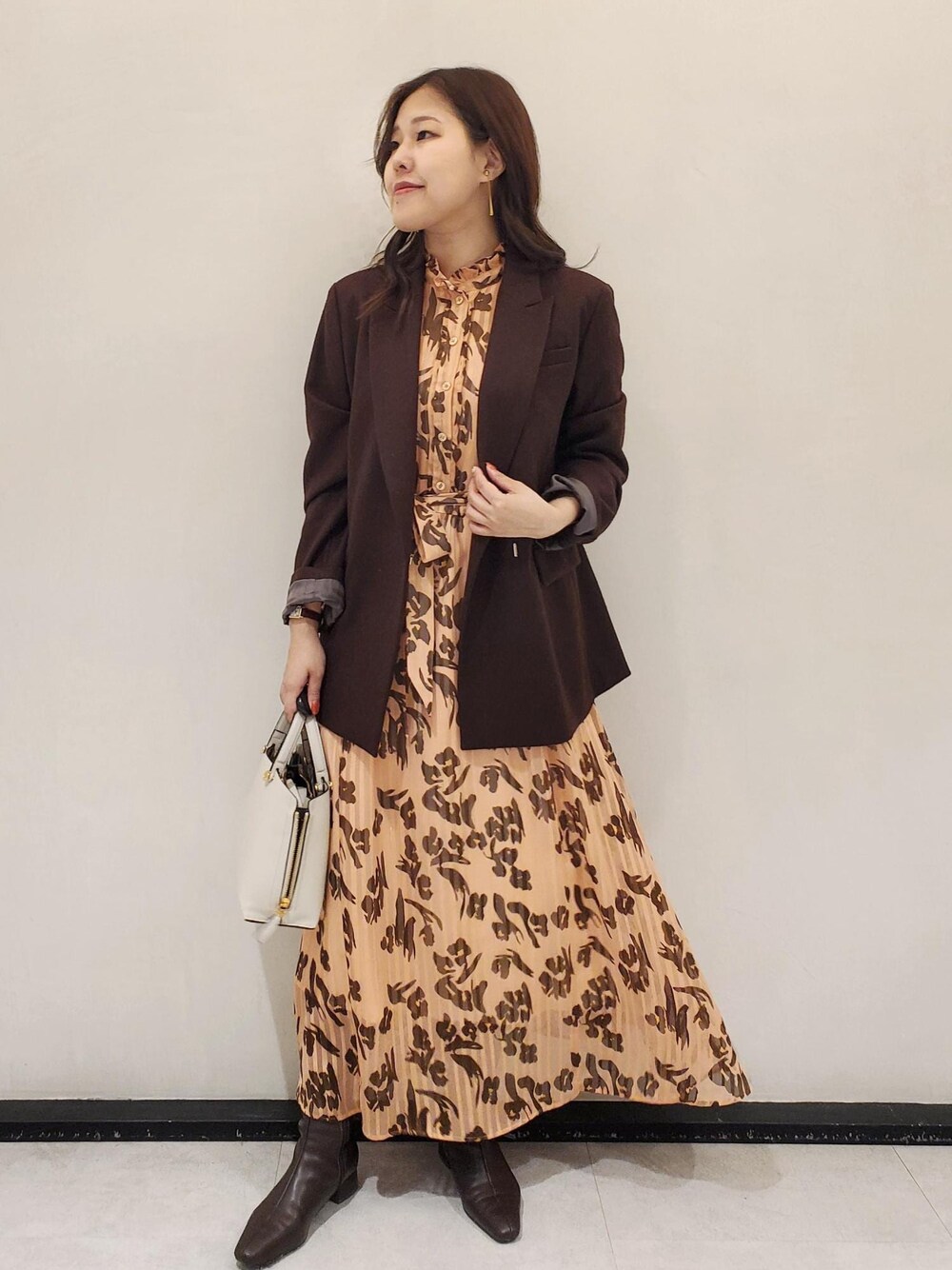 ブラウンとピンクみのあるオレンジカラーで 柔らかなお出かけスタイルにしてみました◎ お出かけはもちろん、お食事会などにも おすすめのワンピースです♪ ※ブーツ、イヤリングはスタッフ私物です。
