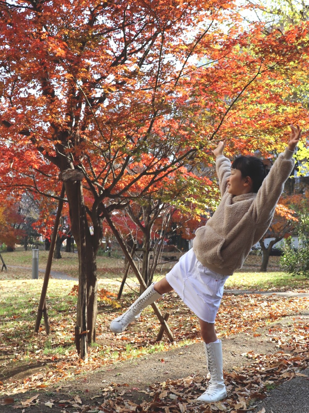 購入したお気に入りの白いブーツ履きたいね〜で散歩。 近所の公園にあるもみじ。小ぶりだけど綺麗に色づいてました。