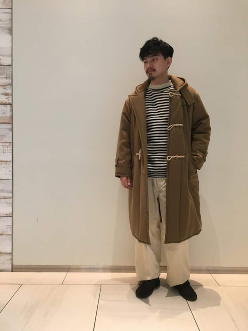ダッフルコートとフィッシャーマン ニットの組み合わせ。 二つとも昔漁師さんが着用してたアイテムで相性は抜群です。 ベージュとオフホワイトのワントーンの色合わせで上品で優しい印象を与えます。
