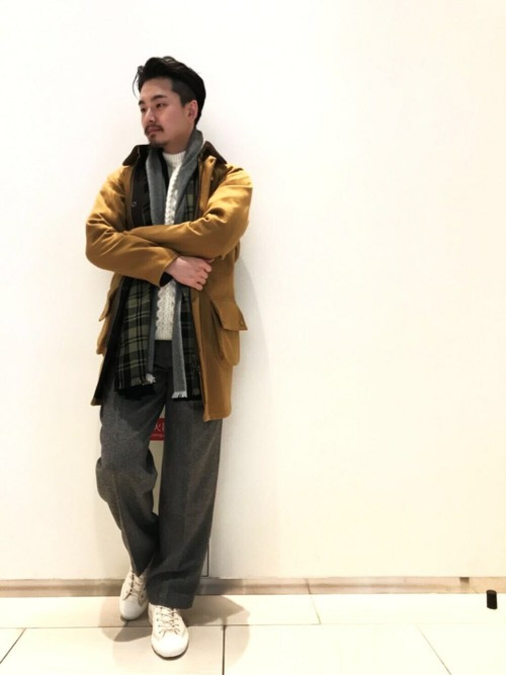 Barbourは定番のワックスコットンではなく、ウール素材を使ったモーターサイクルコートが新鮮! アランセーターを合わせたラギッドなコーディネートに、スニーカーで抜け感をプラス!