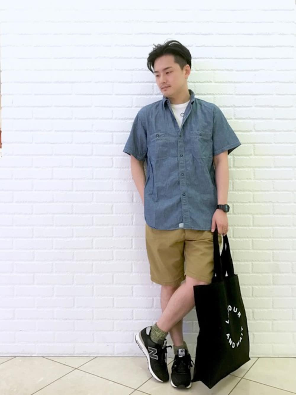 シャンブレー X ショ-トパンツのカジュアルスタイル。 小物を黒で統一して、締まりのあるコーディネートに。 クッション性抜群のニューバランスは、夏の行楽でも活躍してくれます。