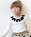 可愛さ満点のキッズコーデ! 白い長袖トップスに黒い花モチーフがアクセント。 ドット柄のふんわりスカートはゴールドのウエストが華やか! 黒のソックスで引き締めて、モノトーンがおしゃれな印象に👍