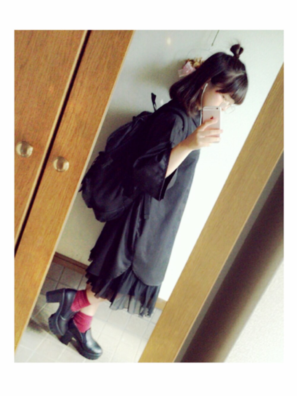 こんにちは✨ 今日は全身真っ黒クロスケさんコーデ🐼⚫️◼️◾️ 靴下にエンジ色を入れてちょと落ち着きました🎴 メイクもオフェロにしていつもと雰囲気変えました💭 今日は自主休講してしまったのでゆったりと1人で梅田をぶらぶら〜&自主勉強!!