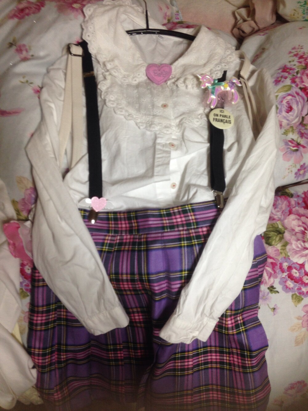 パープル系のスカートを着用したレディースの秋コーディネートの1枚目の写真