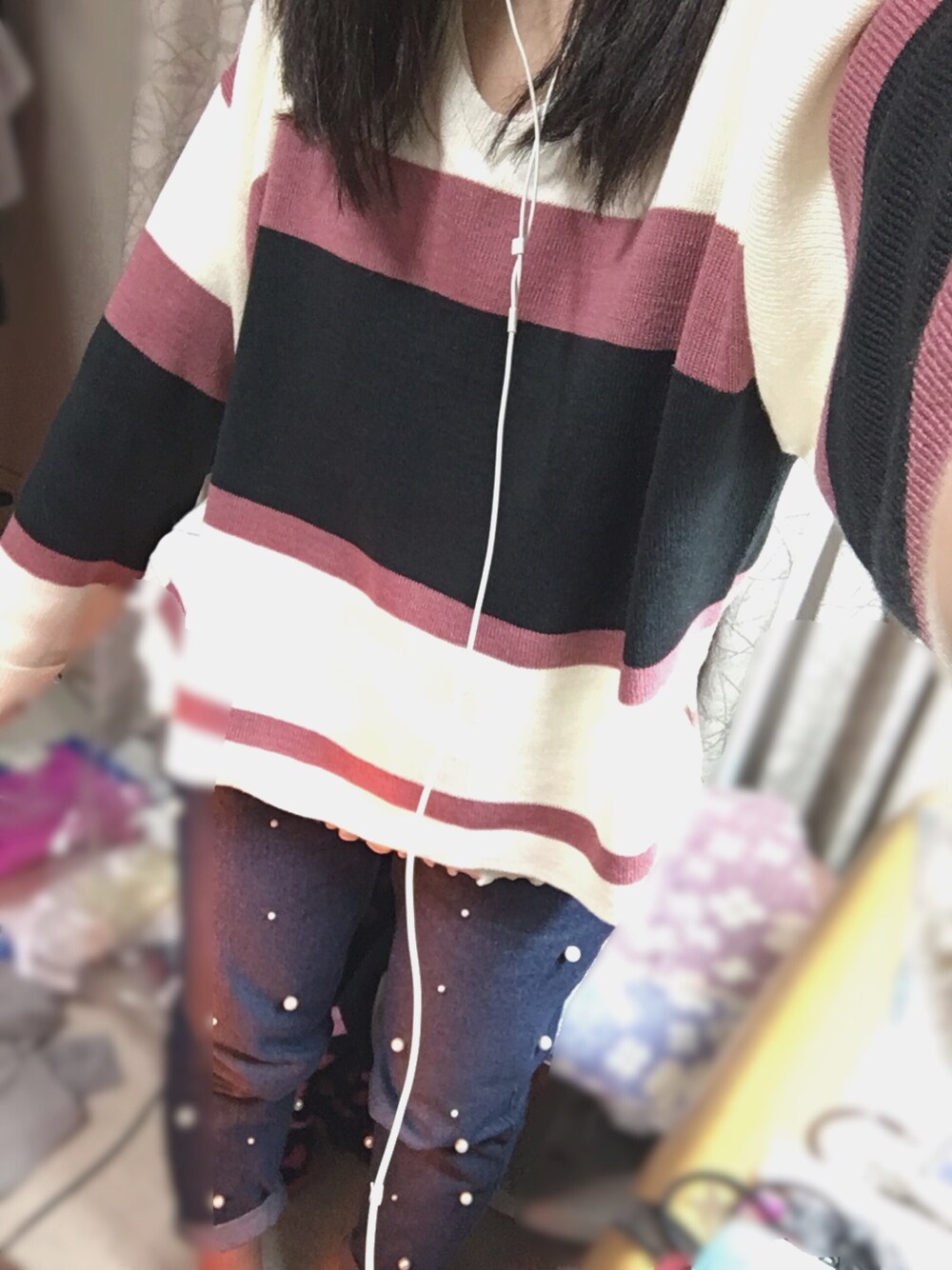 あやかのニット/セーター「マルチボーダーVネックニット」を使ったコーディネート