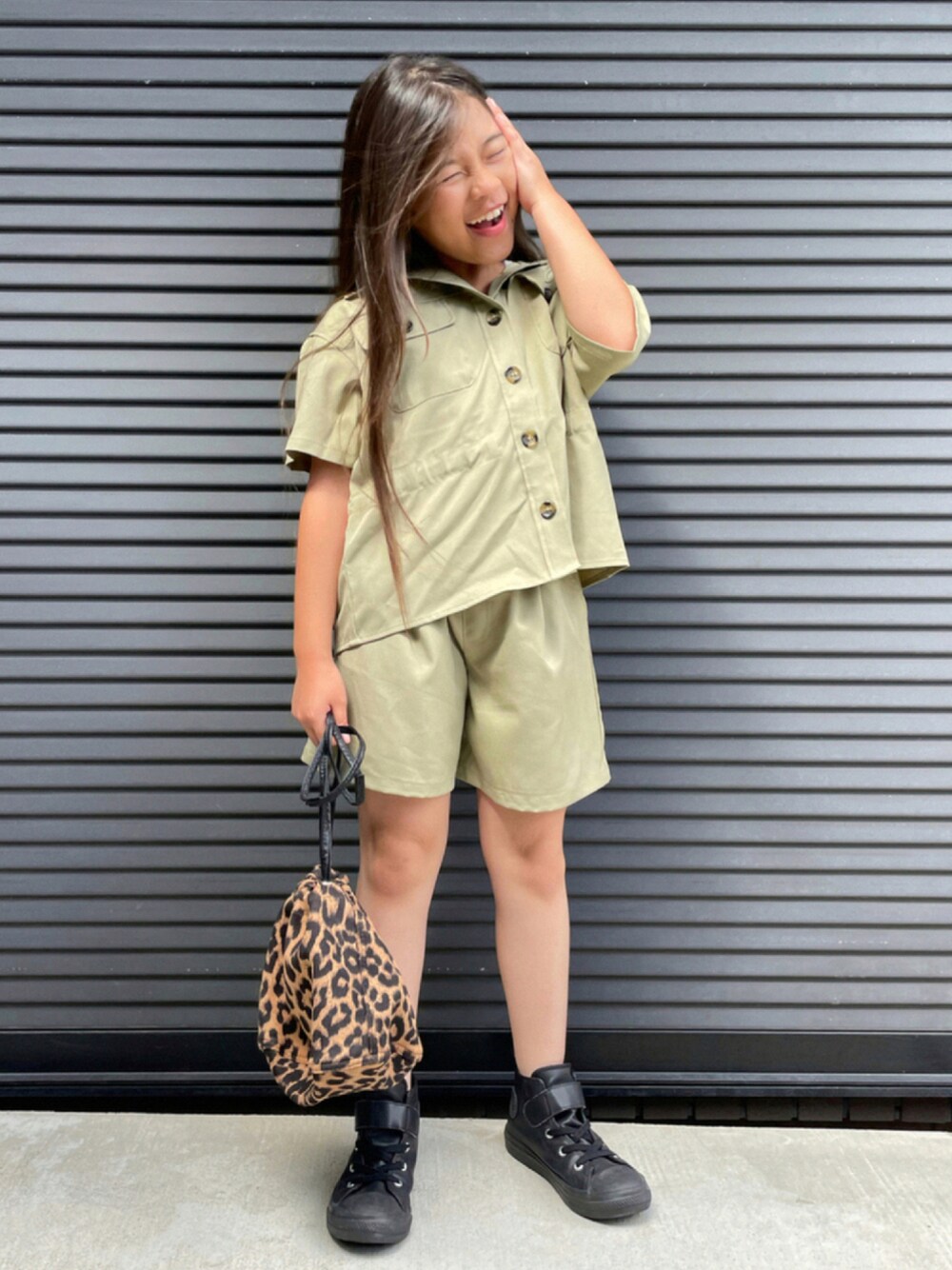 サファリのセットアップ💚 サファリだけに、レオパ合わせました🐆 昨年買って、投稿しないまま時が過ぎた😅 パンツも130にしとけばよかった🙄 バッグで秋っぽく🍁 またも小窓で大暴れ💃 昨日やっと夏休み宿題ほぼ終了💦 夕方、ご褒美でメザスタやりに行って、Reyの好きなハンバーグ食べてきました🎶 あと今日の午前ソフトボール練習後に午後、自由研究で作った物の説明文を書くらしい😅 本当ギリギリ❕ 明日は始業式🏫 今月もたくさんのいいね❤️お気に入り➕ありがとうございました🙇♀️ 身長128cm 体重27kg