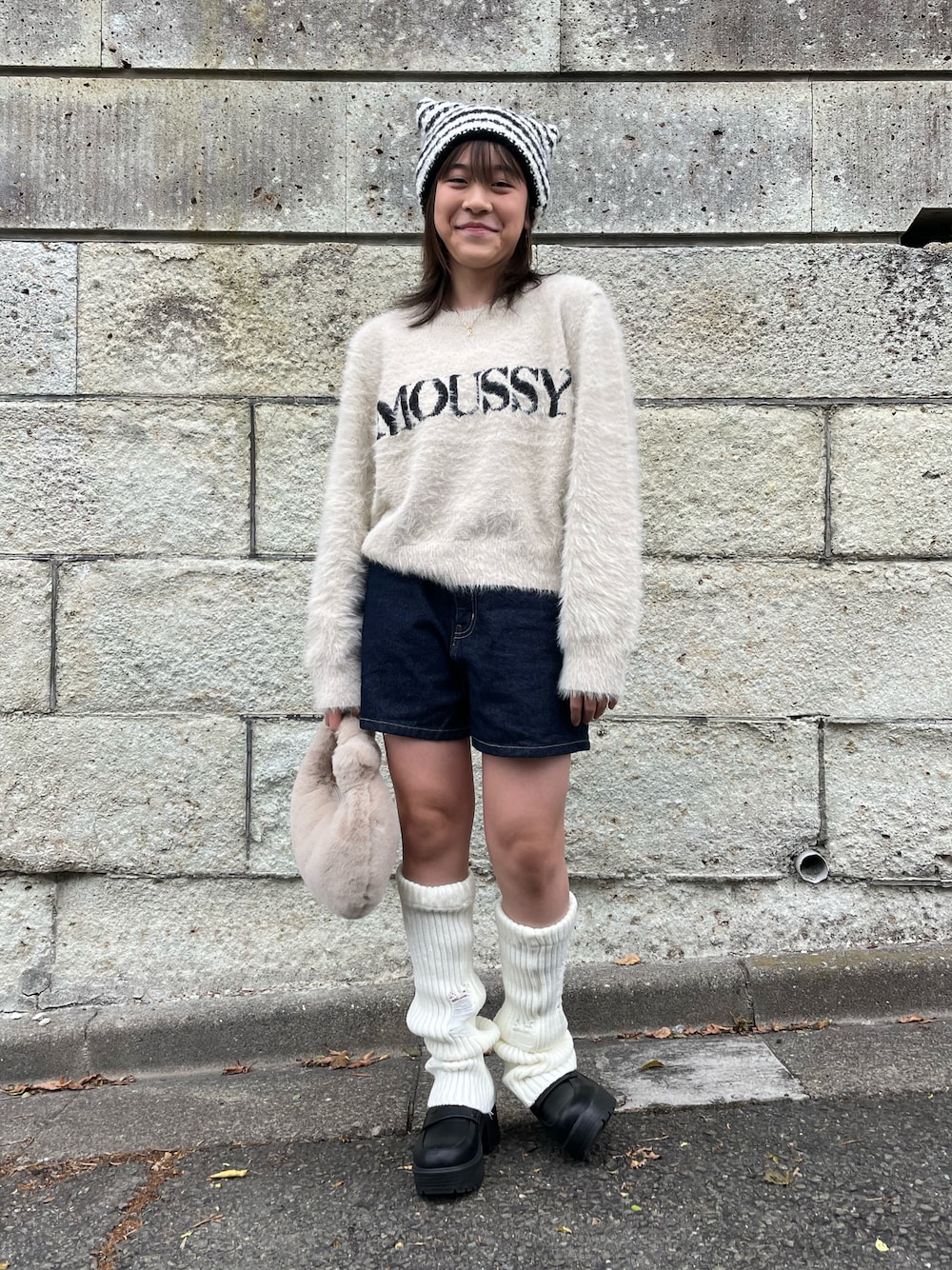 Rey のニット/セーター「【ZOZO・一部店舗限定】SHAGGY MOUSSY LOGO KNIT / シャギーマウジーロゴニット」を使ったコーディネート
