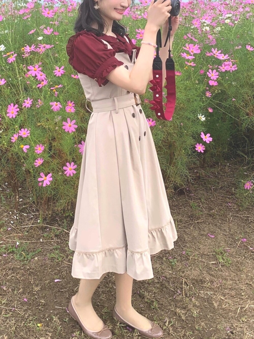 Bordeaux × beige⋆*✩⑅ コスモス畑コーデ♡ カメラストラップもボルドー❁ axesのトレンチワンピースがお気に入りです^ ^