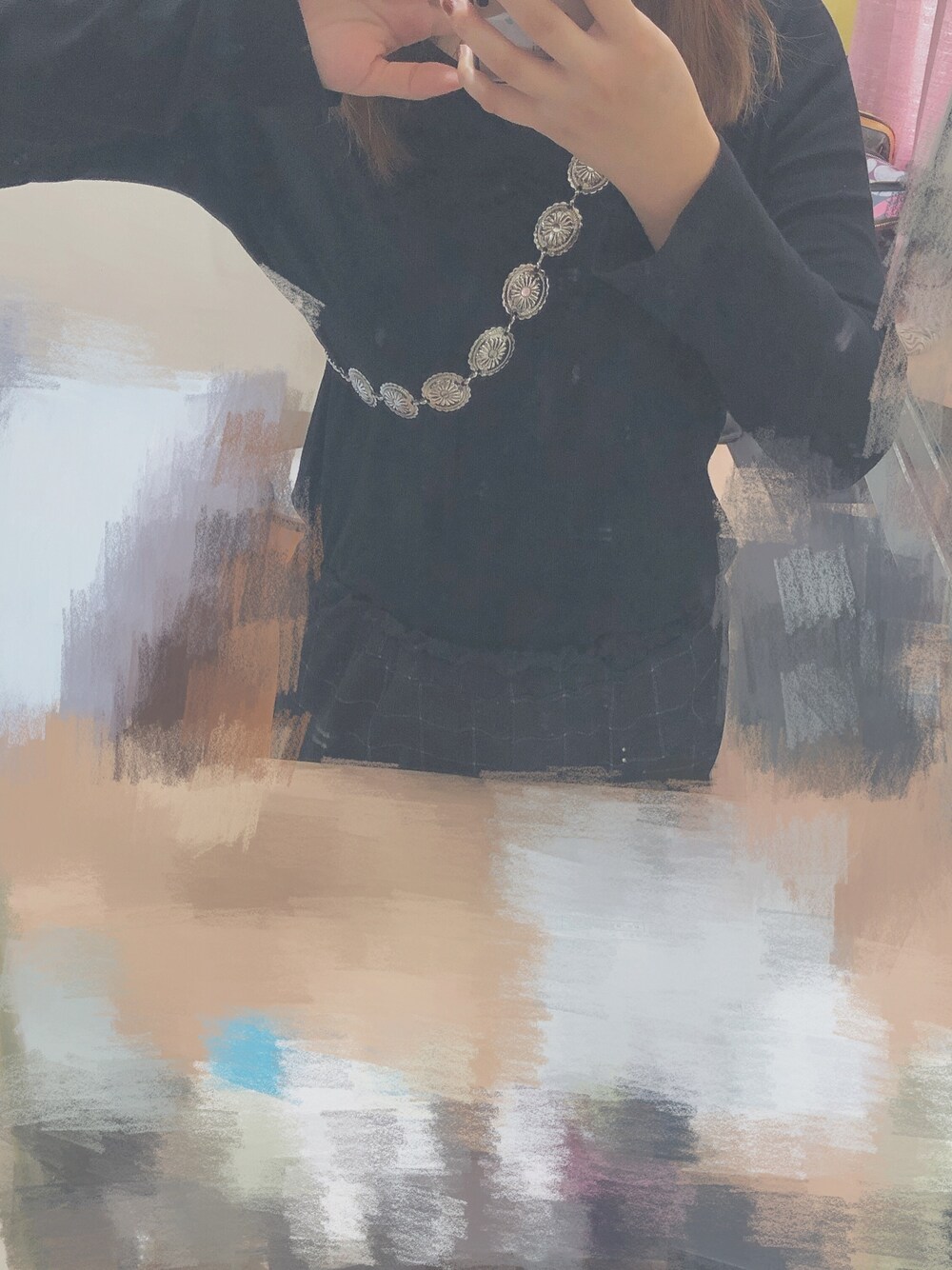 シルバー系のベルトを着用したレディースの秋コーディネートの1枚目の写真