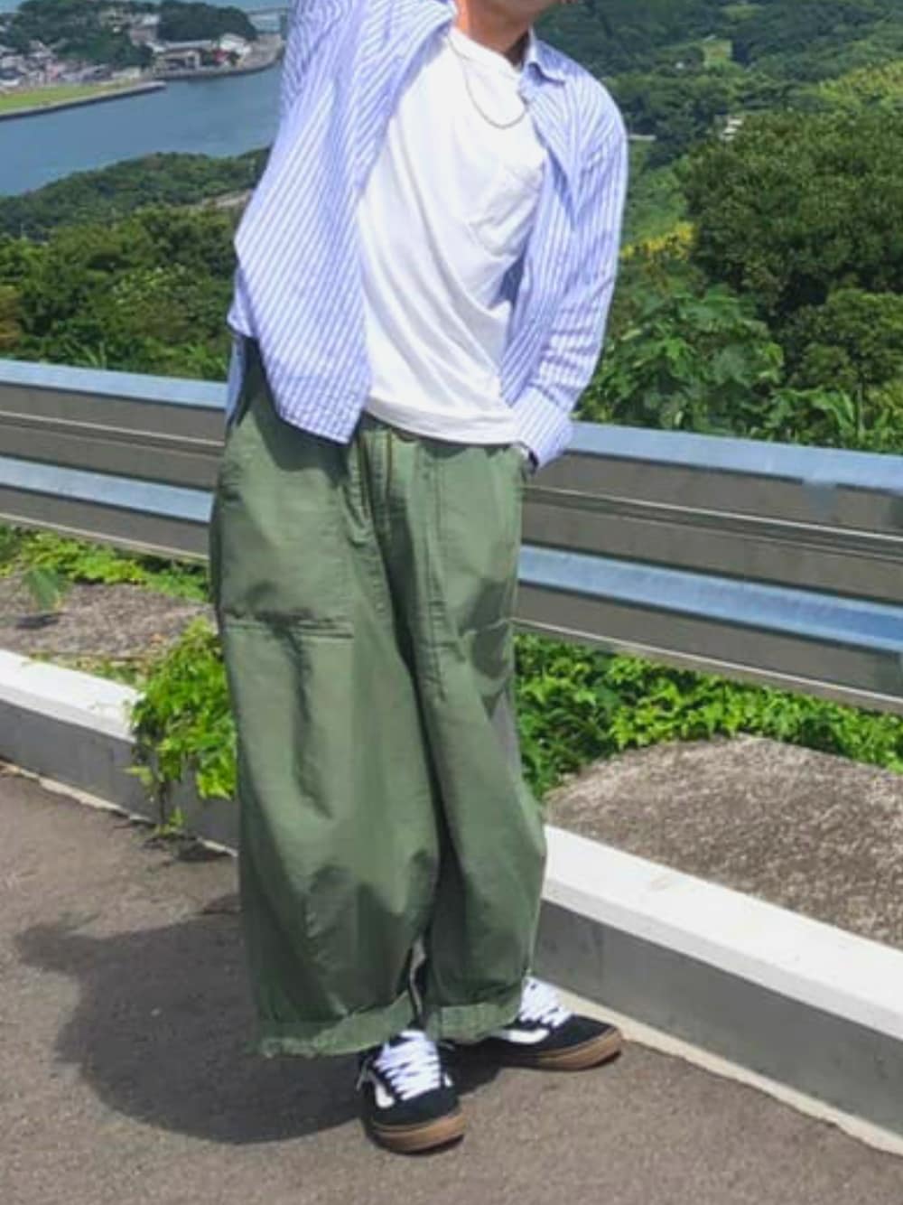 ブルーのストライプシャツ×needlesのヒザデルパンツの王道スタイル🪡🦋✌️
