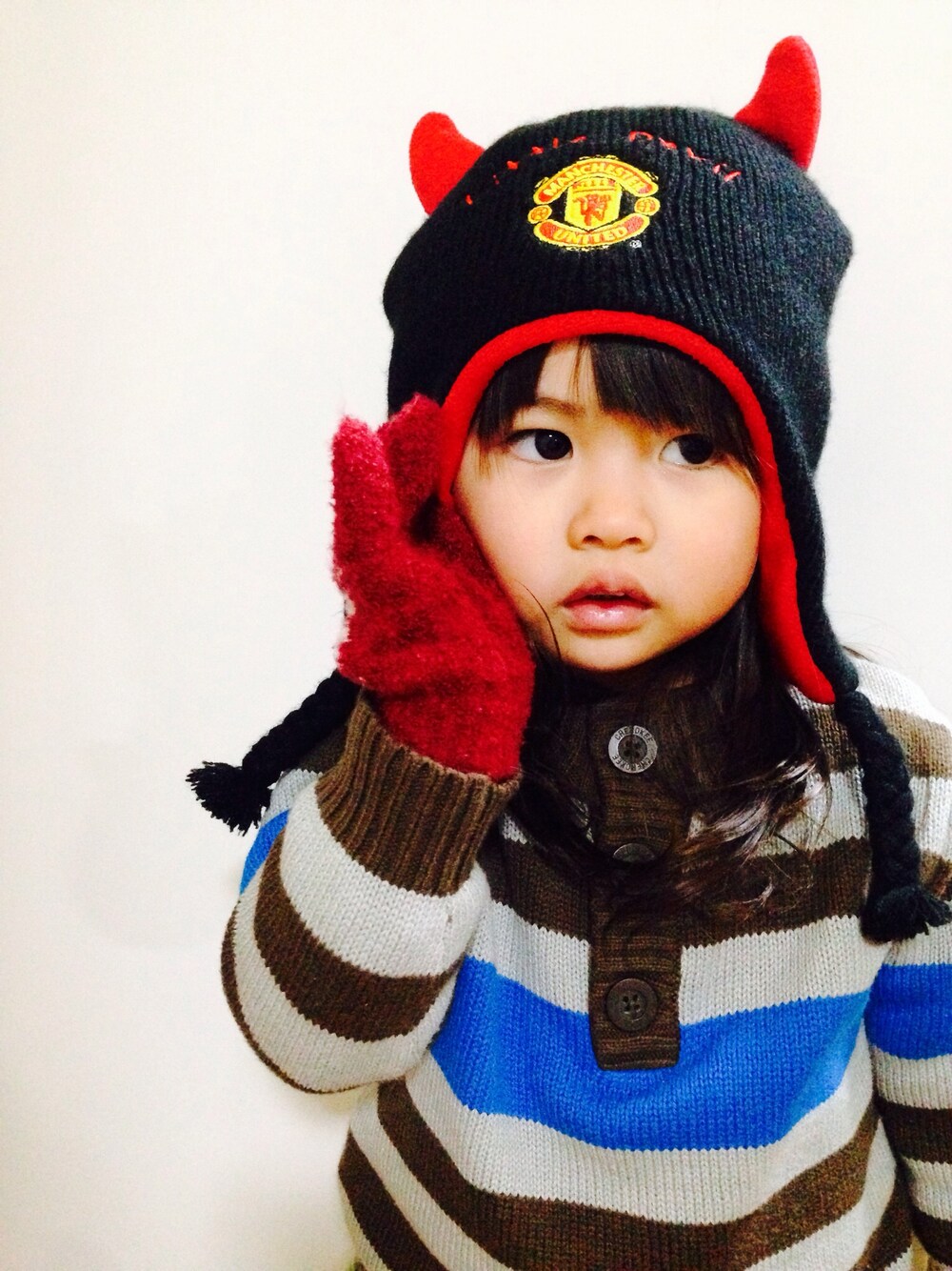 マンチェスターUのニットキャップ(❛ᴗ❛(❛ᴗ❛♡ 前から気になってて息子用に購入したんだけど…まだまだ大きかったから娘着用w 手袋もして、コレで自転車乗るんだ〜!と言ってたよァ,、'`( ꒪Д꒪),、'`'`,、