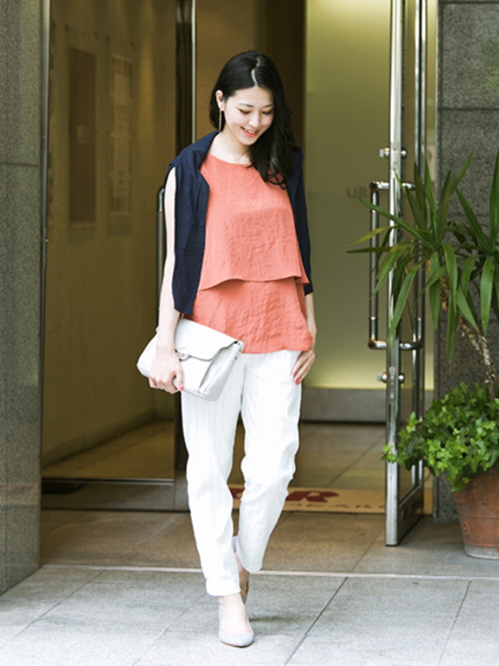 パッと目を引くオレンジのトップスにはネイビーのカーディガンで、大人の印象に。ストライプのパンツはリネン素材で真夏も大活躍間違いなしでさ。