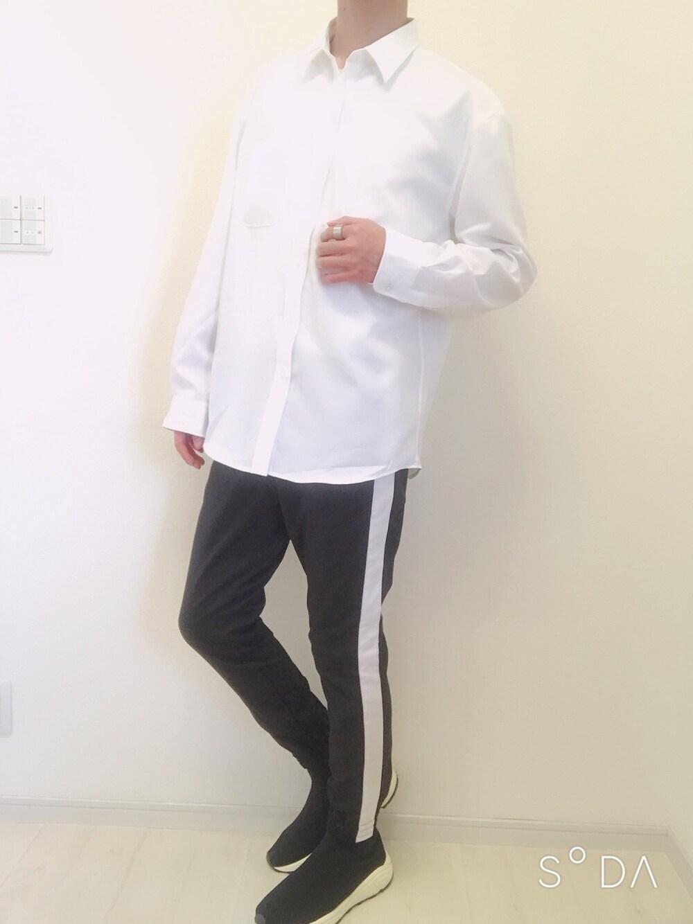 ⛹スポーツMIXコーデ⛹ ラインパンツに白シャツを合わせて、モノトーンでシンプルなコーデにしました! 清潔感も出ていていい感じです!