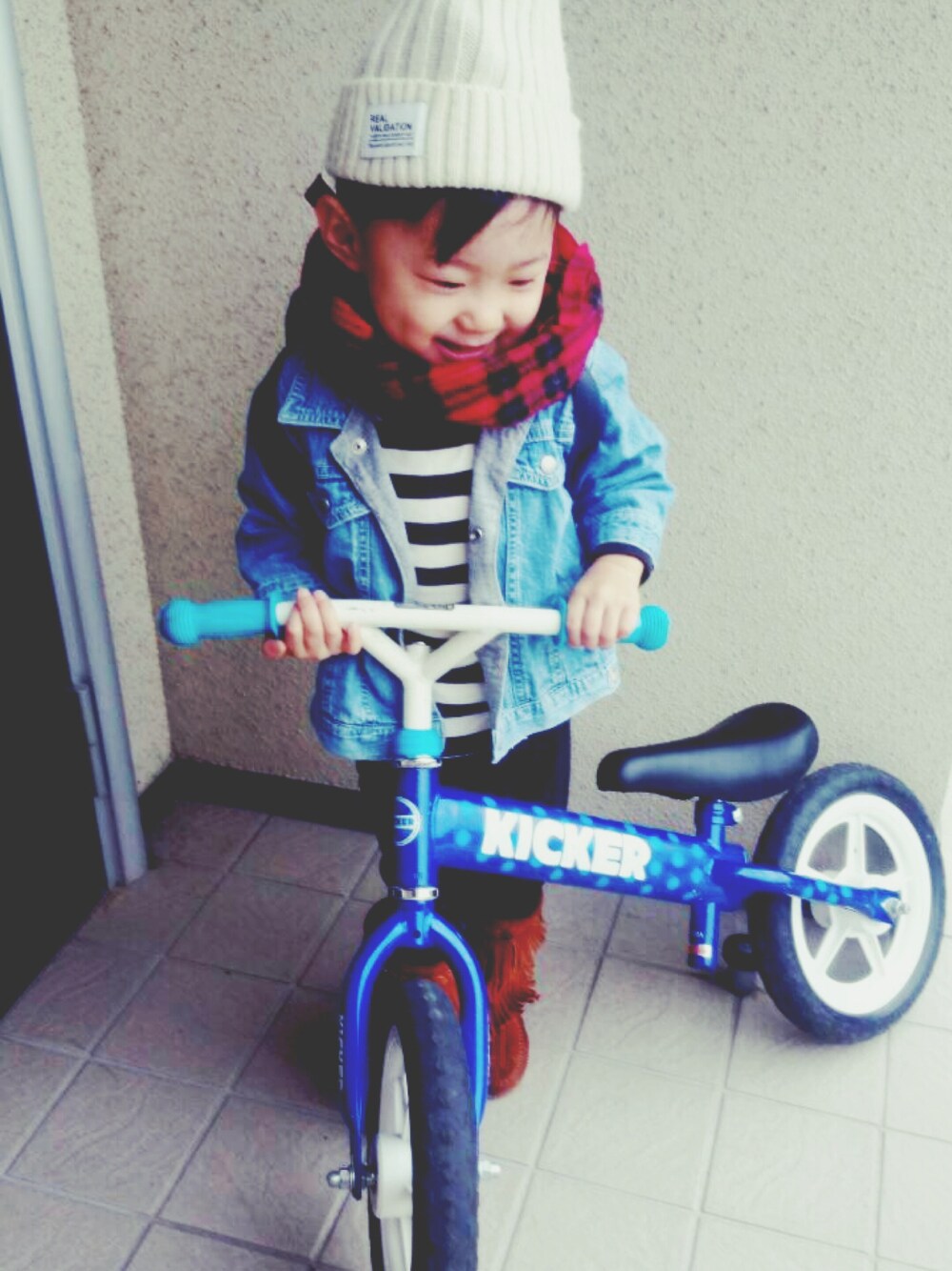 自転車に乗る練習。 アウトドア派の彼。 寒いのに子供はげんきだなー