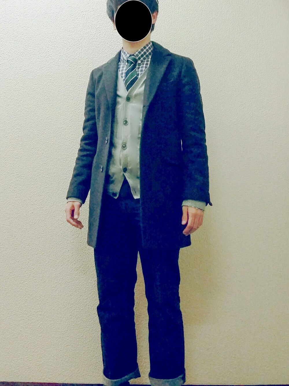 初投稿です!! 柄シャツ×柄ネクタイで合わせて、 チェスターコートですっきりまとめてみました🙆