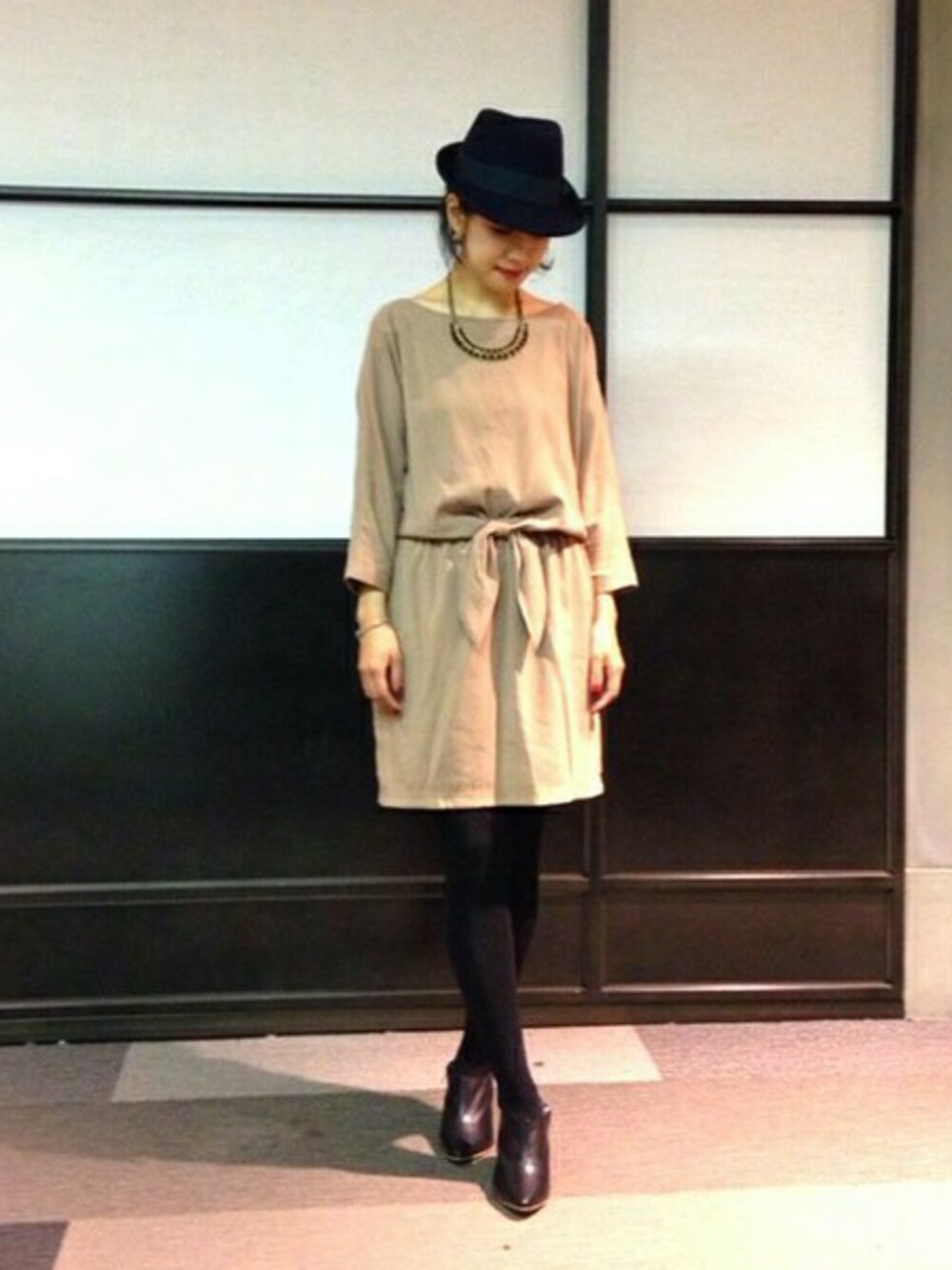 リボンのデザインが女性らしいワンピース。カジュアルにもキレイ目にも使える便利な一枚です。 黒の小物でカッコよくコーディネートしました。今年らしいデコラティブなアクセサリーがポイントです。