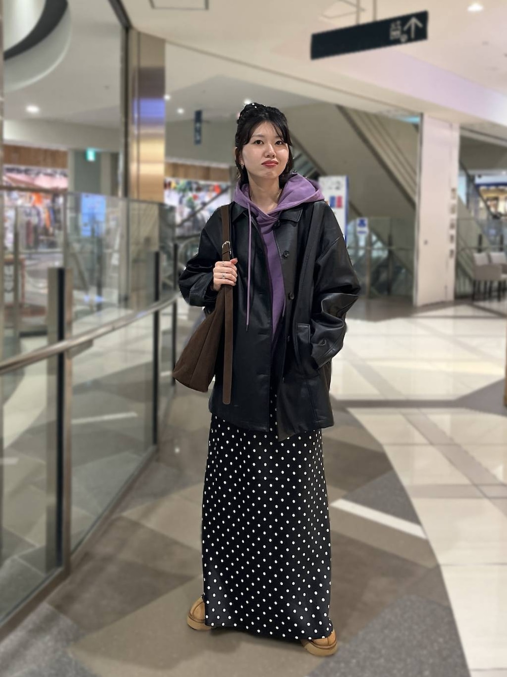 パープル×ドットコーデ🍇🐩 シルエットが丸くて着るだけで可愛いフーディ 古着っぽい色味が可愛いです♡ スカートは大人気のシワサテンスカートです 寒い時期でもニットなどしっかりとした素材感との相性も良く沢山着回しできます
