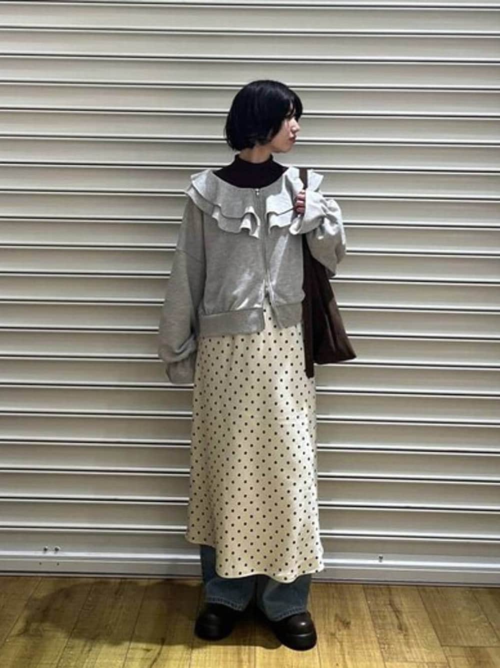 大人気の春服を2月でも使えるコーデで 組んで見ました✨ フリルZIPウラケは 素材は分厚過ぎずに軽く羽織で春も使って頂けます! 首周りも開いているので、冬はインナーにタートルを入れると長く使って頂けます🍀*゜