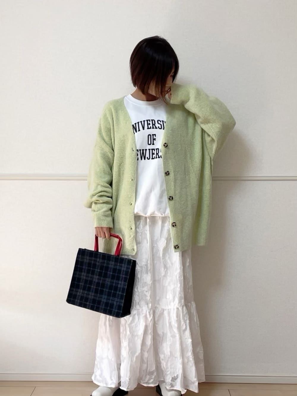 ♡ 、+ 、フォロー ありがとうございます╰(*´︶`*)╯ ホワイト×ライトグリーン で春コーデ🌸 と言っても裏起毛スウェット とニットカーディガンで あったか仕様です◎ このカーディガンは何色か 持っててオーバーサイズを ざっくり羽織って着るのが 好き◎ +* ゚ ゜゚ *+:。.。.。:+* ゚ ゜゚ *+:。.。.。:+*゚ ゜゚ *+ ▪️outer:ANGIE オーバーサイズVネックニットカーディガン ライトグリーン / Fサイズ 肌触りが良くもちもちした ニットカーディガン✨ チクチク感がなくストレス フリーで着用出来ます◎ ゆったりとしたオーバー サイズシルエットで ざっくりと羽織っても🙆♀️ 春らしいライトグリーンは 寒い時期からの春先取りに もオススメ◎ ⏩ZOZOTOWNにて SALE価格で3,960円 ⏩さらに1000円クーポンで 2,960円に💕 ▪️tops:ANGIE 【2022年秋冬新色追加】GILDANカレッジロゴオーバーサイズスウェット ホワイト×ブラック / Mサイズ 程よいオーバーサイズ感で ゆるカジュアルにピッタリ 裏起毛で冬まで大活躍の スウェット✨ シンプルなデザインだから こそ着回し力抜群✨ 肩落ちしたデザインと 長め袖で華奢見え効果も◎ 古着っぽいカレッジロゴが コーデのアクセントに◎ ⏩ZOZOTOWNにて 1000円クーポン出てます💕 ▪️skirt:ANGIE 【megコラボ】シアージャガードティアードスカート ホワイト / Fサイズ 一見レースのように見える たっぷりボリューミーな ジャガード生地がフェミニン なティアードスカート✨ ティアードの切替え位置が 下なのでマーメイドライン に近いシルエットで 大人っぽく着ることが 出来ます◎ 若干透け感があるので ペチコートの使用を オススメします ⏩ZOZOTOWNにて 1000円クーポン出てます💕 ▪️shoes:ANGIE 厚底サイドゴアショートブーツ アイボリー / Mサイズ 定番アイテムとなった サイドゴアブーツ✨ 存在感がありコーデの バランスが取りやすい◎ 厚底ソールで盛れるのに フラットなので歩きやすく 白と黒のカラーバランスが 絶妙で使い勝手良き◎ ⏩ZOZOTOWNにて SALE価格で4,290円 ⏩さらに1000円クーポンで 3,290円に💕 ▪️bag:agnes b. TAX02A-01 トートバッグ ネイビー ダークトーンのチェック柄 にレッドのハンドルが ワンポイントのトート✨ フェルト生地で温かみが ありデイリーユースに ピッタリ✨ 底板が入っていて強度も 十分あります◎ +* ゚ ゜゚ *+:。.。.。:+* ゚ ゜゚ *+:。.。.。:+*゚ ゜゚ *+ Instagram▷uni.roygbvp 17LIVE▷uni🐶うに🥺💕