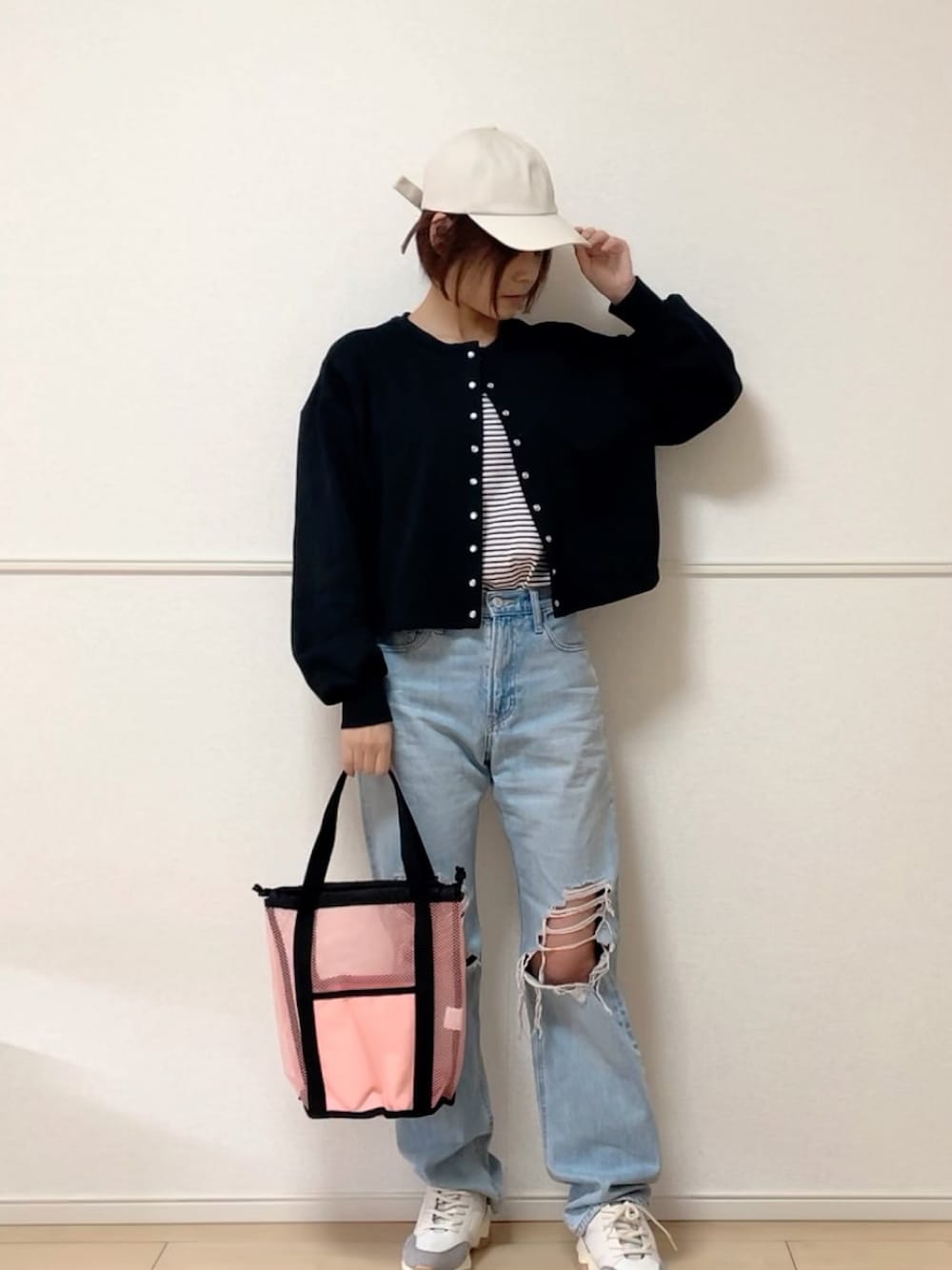 ♡ 、+ 、フォロー ありがとうございます╰(*´︶`*)╯ メンズライク✨ ピンクのバッグを差し色に 女性らしさを残して◎ +* ゚ ゜゚ *+:。.。.。:+* ゚ ゜゚ *+:。.。.。:+*゚ ゜゚ *+ ▪️outer:Riberry 前後2WAY スナップボタン裏毛カーディガン ブラック / Mサイズ 着回し力抜群!今の時期に 大活躍する裏毛カーデ✨ スナップボタンが今っぽく スタイルアップも叶う ショート丈が嬉しい✨ スウェット素材で楽ちん なのにカジュアルすぎず キレイめとの相性も良き◎ ⏩ZOZOTOWNにて SALE価格で2,699円 ▪️tops:ITEMS URBANRESEARCH クルーネックノースリーブTシャツ ボーダー / Fサイズ 細めボーダーとノースリーブで 子どもっぽくならない 大人カジュアルにピッタリ✨ そのままストンと着ても🙆♀️ INして逆三角シルエットも🙆♀️ ▪️bottoms:ユニクロ ストレートハイライズジーンズ(ダメージ・丈標準78.5cm) ブルー / 23サイズ ワイドパンツほど太くなく 履き心地楽ちんなデニム✨ 最初からダメージ加工が しっかり入っているのも🙆♀️ 薄めブルーの色味も これからの季節にピッタリ ▪️shoes:ANGIE ダッドスニーカー ベージュ / Mサイズ レザーとスエード素材が 秋冬にピッタリ!ヘビロテ 間違い無しのスニーカー✨ ダッドスニーカー特有の ソールがボリューム感を 足下に出してくれるので コーデ全体のバランス が取りやすい◎ 何にでも合わせやすい 淡色ワントーンも🙆♀️ ⏩ZOZOTOWNにて SALE価格で5,346円 ⏩さらに1000円クーポンで 4,346円に💕 ▪️cap:ジーユー キャップ / ベージュ バックリボンが可愛い💕 ガーリーコーデとも 相性良き🙆♀️ +* ゚ ゜゚ *+:。.。.。:+* ゚ ゜゚ *+:。.。.。:+*゚ ゜゚ *+ Instagram▷uni.roygbvp 17LIVE▷uni🐶うに🥺💕