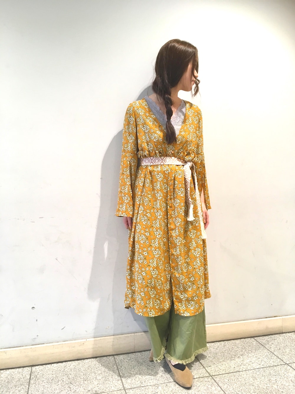 素朴な小花のプリントがボリュームのあるマスタードのロングカーデに優しさをプラスしてくれます。 甘めのデザインのカーデにマクラメのベルトとカットオフのパンツを合わせて、フォークロアな雰囲気に。