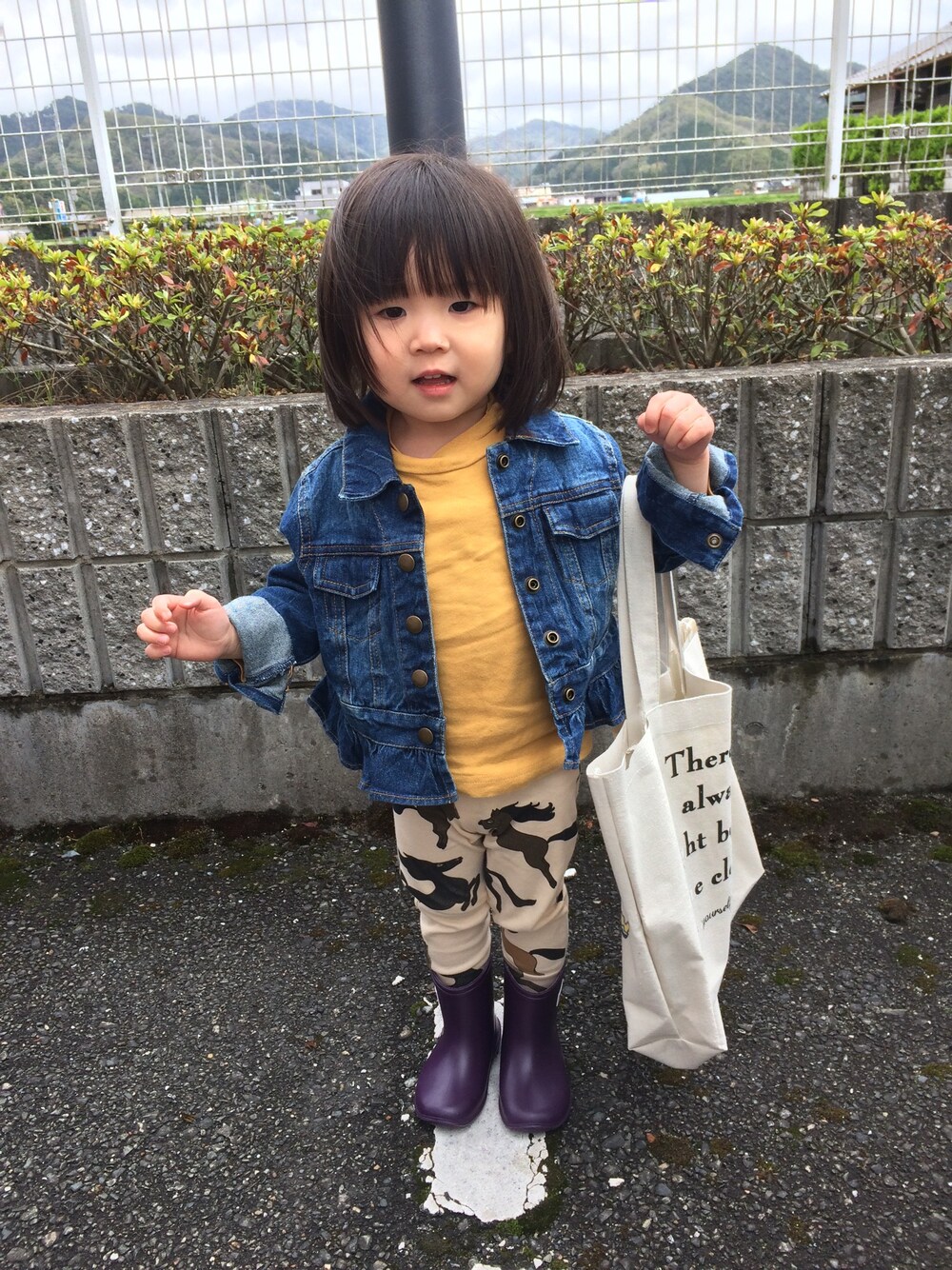 雨の日コーデ。正式には雨上がりの日コーデ?最近長靴を履きたがります(^^;;サイズ大きめにしたから抱っことかカートだとすぐに脱げてしまいます(笑)