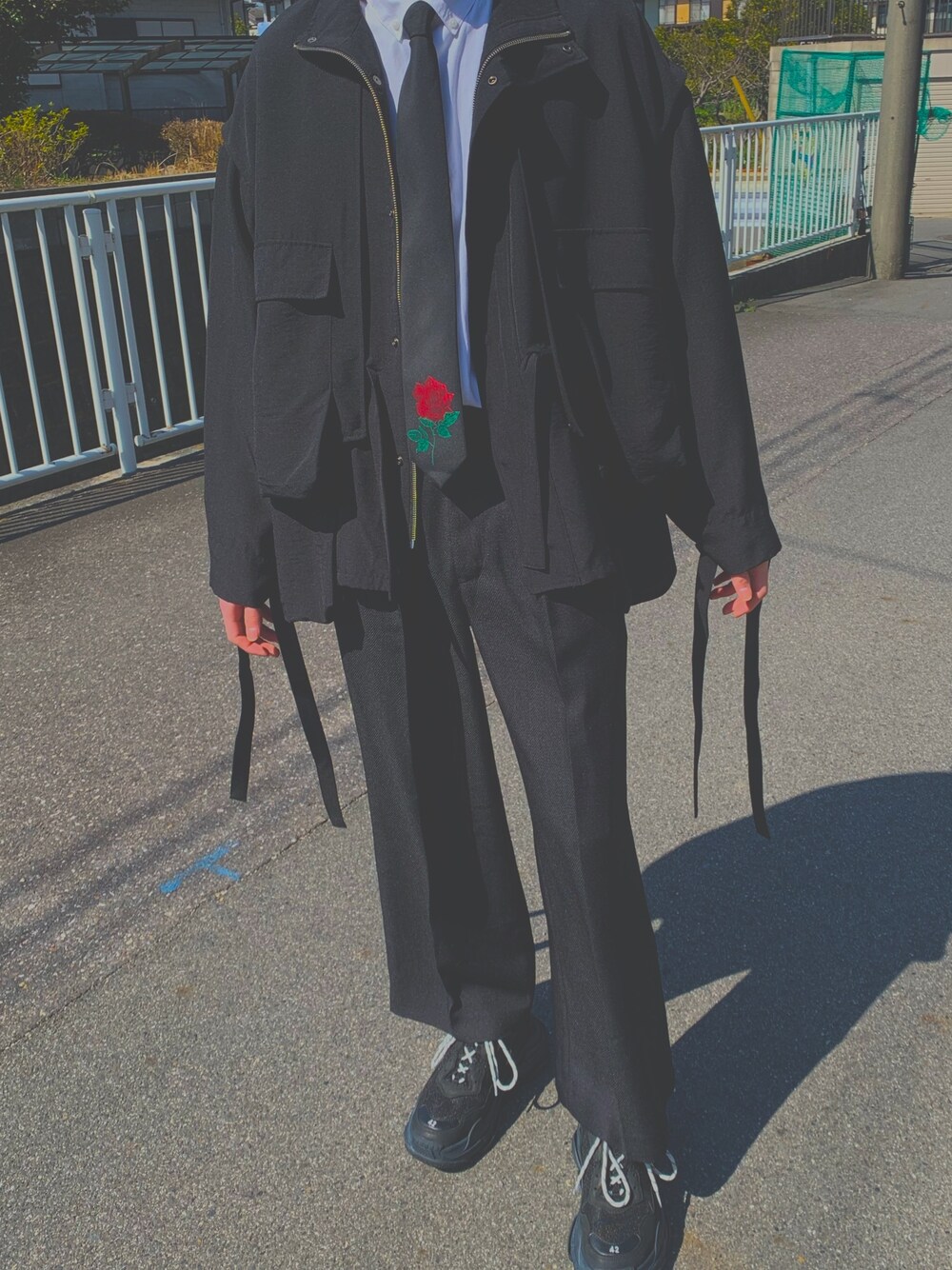 珍しい形のアウター着てみました 袖の紐がかわいい ネクタイも薔薇柄でとてもいい感じです