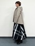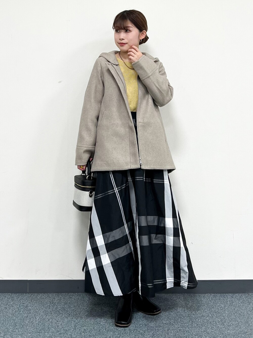 ◇コート 前後差のある丈感で、気になる部分もしっかりとカバーしてくれます◎ フードはボタンで取り外し可能なので、マフラーを付けても苦しくなく着用できます! ◇スカート ウエストゴムで楽チンなスカート。 大きなチェック柄なので幼くならずに着用できます! Sサイズ着用で、ヒールなしでも合わせられる丈感でした。