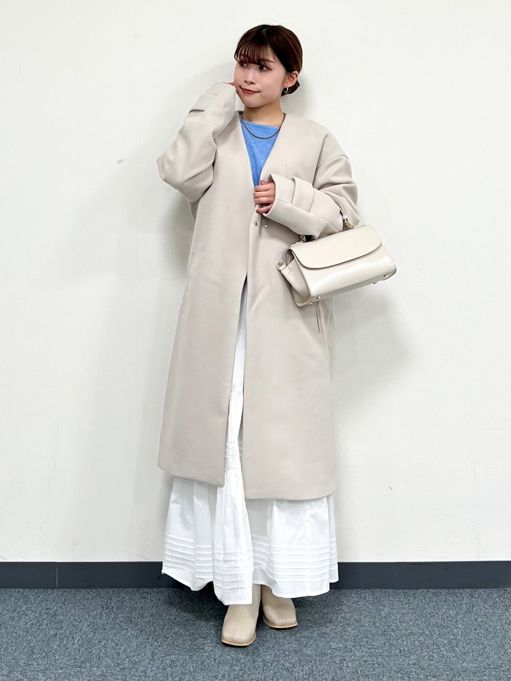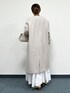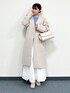 オンオフ使えるロングコート。 ノーカラータイプなので、フードの付いたトップスやマフラーなどを合わせても苦しくなくオススメです◎ バック部分にはスリット入りなので動きやすさもあります! Mサイズ着用で、袖丈がやや長めでした。着丈は、ふくらはぎの真ん中くらいでした。