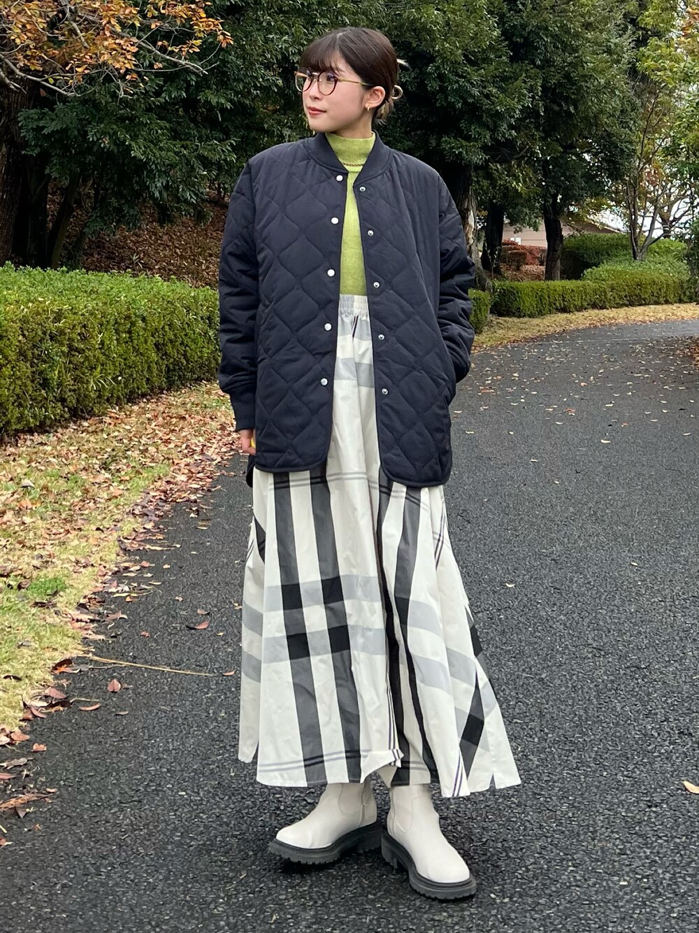 ◇ブルゾン 軽量で、冬に嬉しい蓄熱保温機能付きのキルトブルゾン。 ゆったりとしたサイズ感なので、薄手のインナーを合わせる時はサイズダウンしても◎ ヒップがしっかり隠れるところもポイントです! Sサイズ着用で、袖丈はぴったりでした。 ◇スカート 大柄チェックが大人可愛いチェックスカート。 ヒール無しでも着用できる丈感なので、小柄な方にもオススメです!
