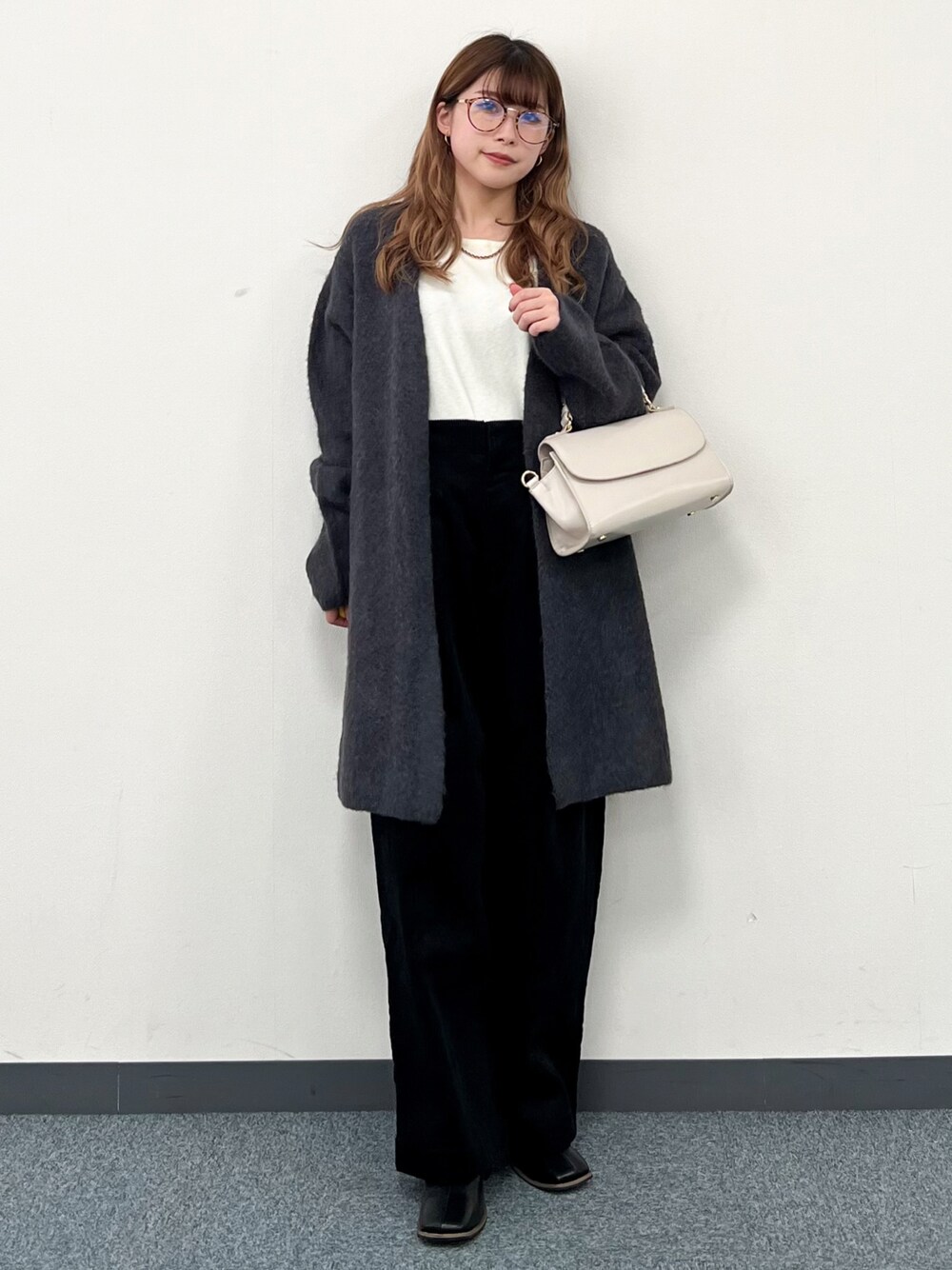 ◇カーディガン フワフワとした触り心地で、柔らかい生地のニットカーディガン。 ヒップがしっかりと隠れて、膝上くらいの丈感なので気になるところもカバーしてくれます◎ ◇パンツ 秋冬定番のコーデュロイワイドパンツ。 ウエスト位置が高めに作られているので脚長効果も◎ ややウエストが大きかったので、1折りして着用しています。