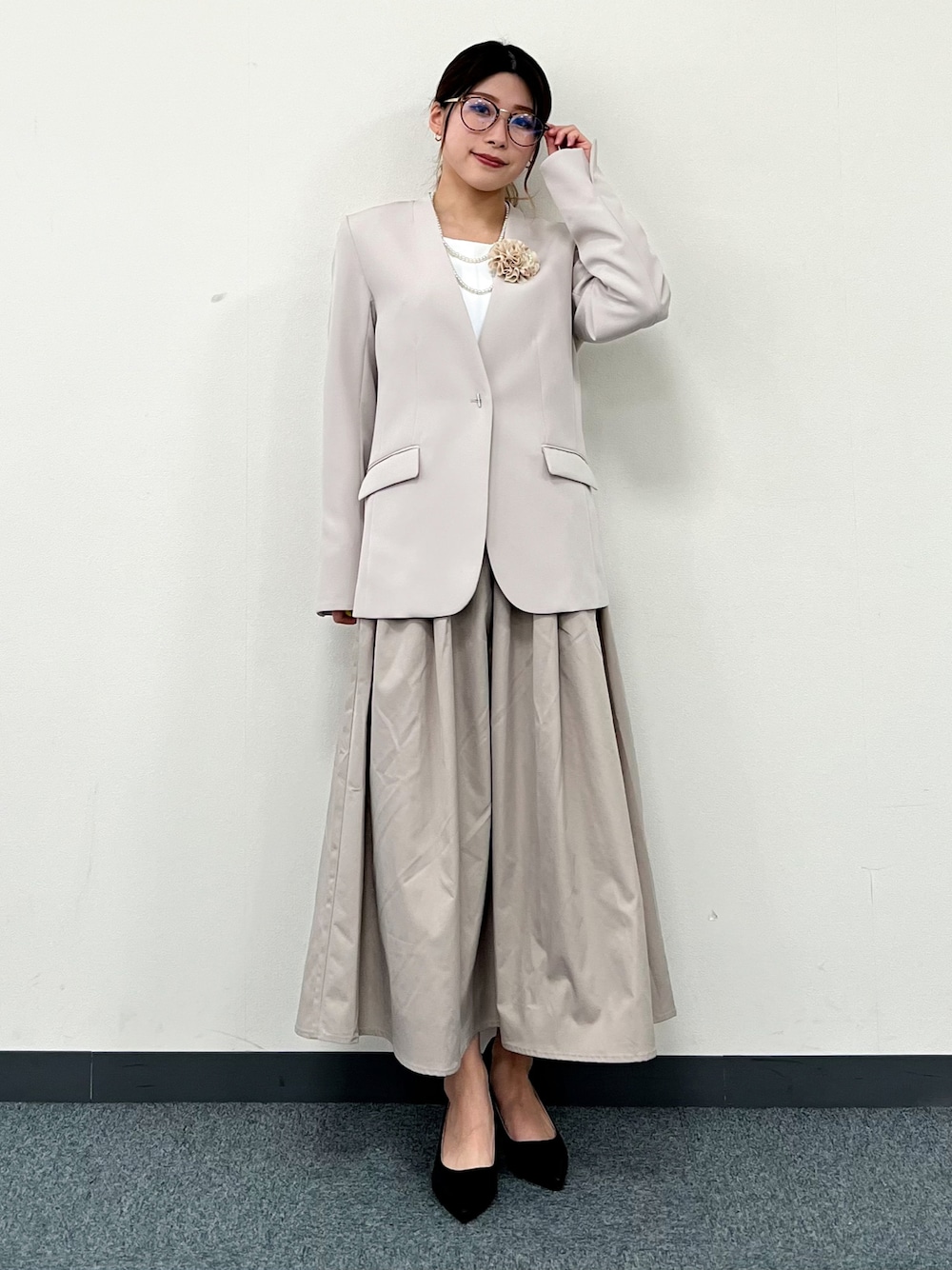 ◇ジャケット マシンウォッシャブル可能なアイテムなので、お子様を抱っこしたり、雨の日にも安心して着用できます! Sサイズ着用で、袖丈がやや長めでした。 ◇スカート サラサラとした触り心地のフレアスカート。 小柄な方にも着用しやすい丈感です◎ Sサイズ着用で、ウエストはピッタリでした
