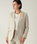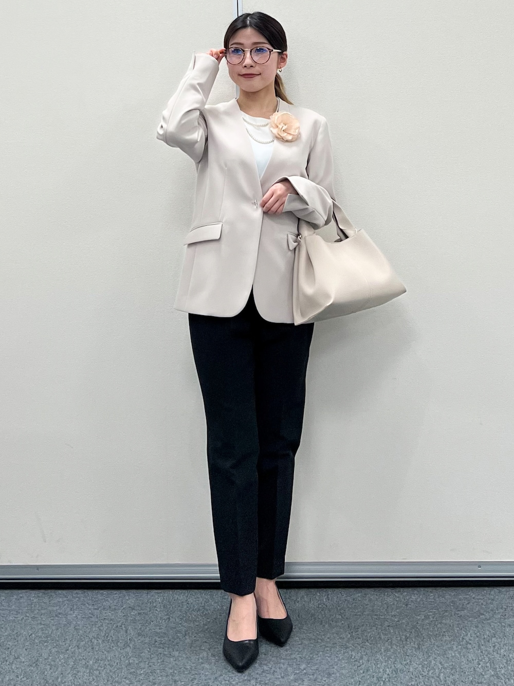 入学式向け♪明るめカラーのジャケットコーデ ジャケット・パンツは、マシンウォッシャブル可能なアイテムで、さらに防汚加工付きで雨の日にも安心して着用できます! お手入れも楽チンなところがポイントです☆ どちらもセレモニー用はもちろん、お仕事用にもお使いいただけます!