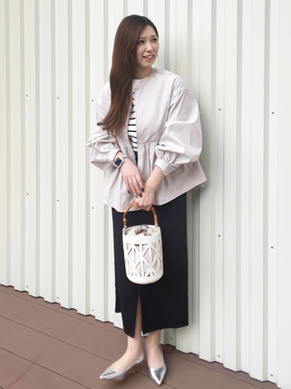 トレンドのペプラムデザインの 春ジャケットにタイトスカートを合わせた 女性らしい華やかなコーデ。 インナーにボーダーをいれることで 抜け感もプラス◎