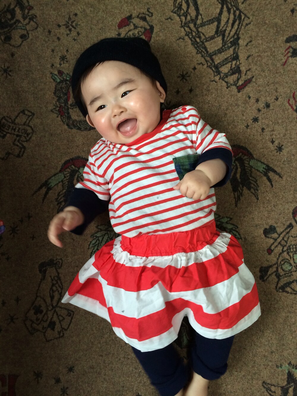 ウォーリーてきなマリンスタイル♪◡̈⃝ ニット帽▶︎▷アメアパ Tシャツ▶︎▷スキップランド ロンパース▶︎▷babyGAP スカート▶︎▷スキップランド レギンス▶︎▷アメアパ
