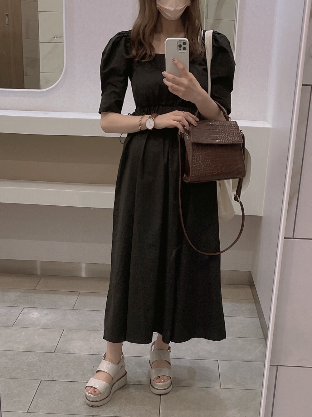 ブラック系のワンピースを着用したレディースの夏コーディネートの1枚目の写真