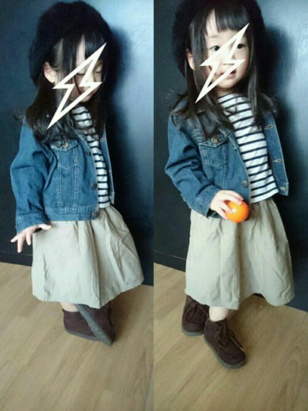 靴下嫌いで結局履いてくれず足元なんか抜けてる感(;_;) コムサの薄いカーキ色スカートはクシャクシャデザインが可愛かったのに洗濯したらただのスカートになってしまった😭 ボーダー✖デニムジャケットは間違いなくて可愛い😋♡