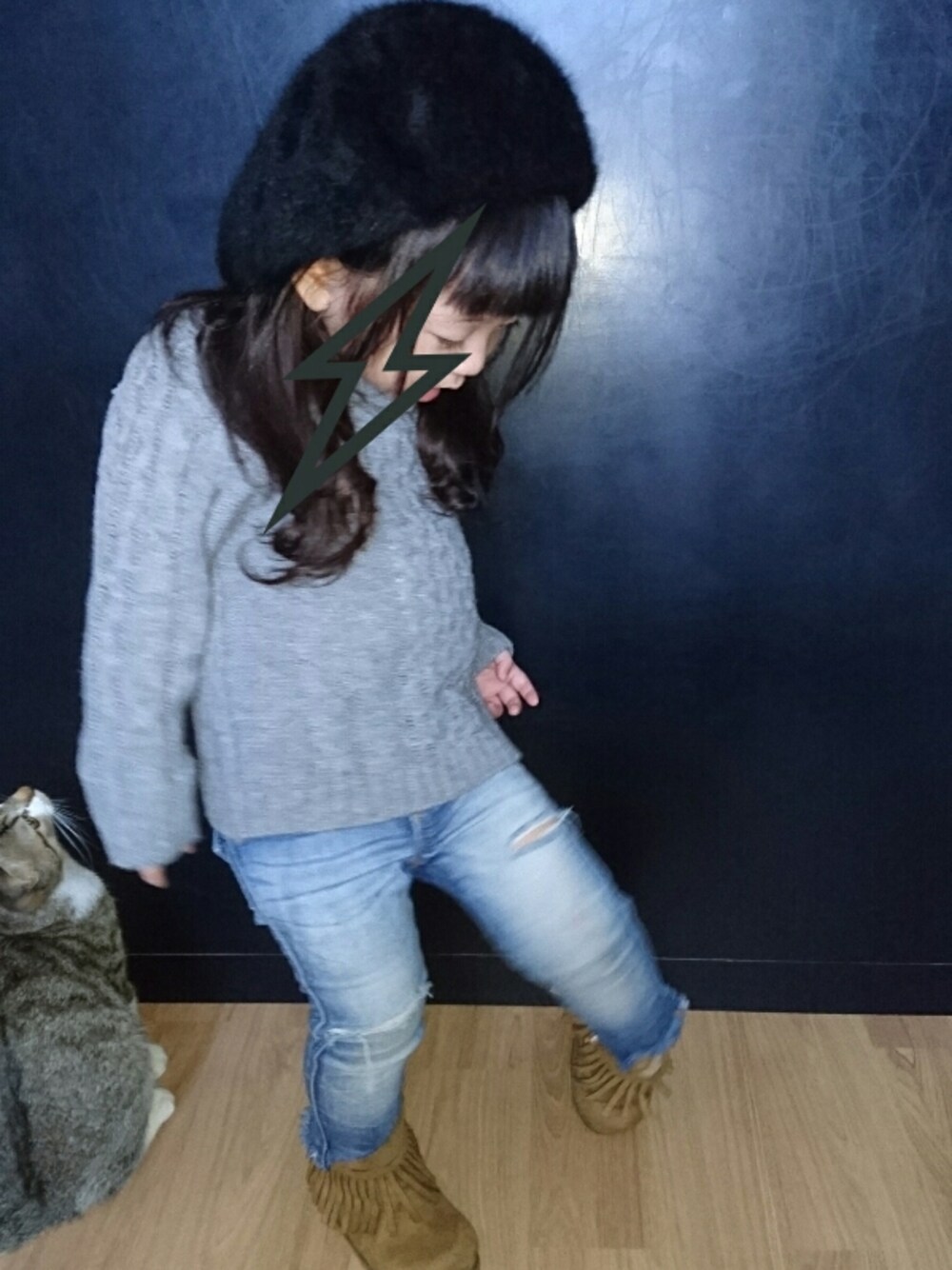 グレー系のニット/セーターを着用したキッズの秋コーディネートの1枚目の写真