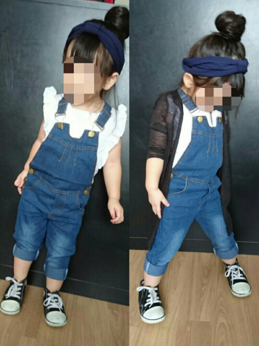 ブルー系のサロペット/オーバーオールを着用したキッズの秋コーディネートの1枚目の写真