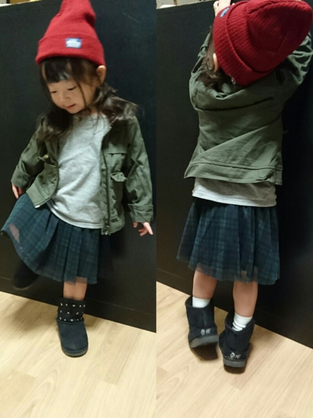 グリーン系のミリタリージャケットを着用したキッズの秋コーディネートの1枚目の写真