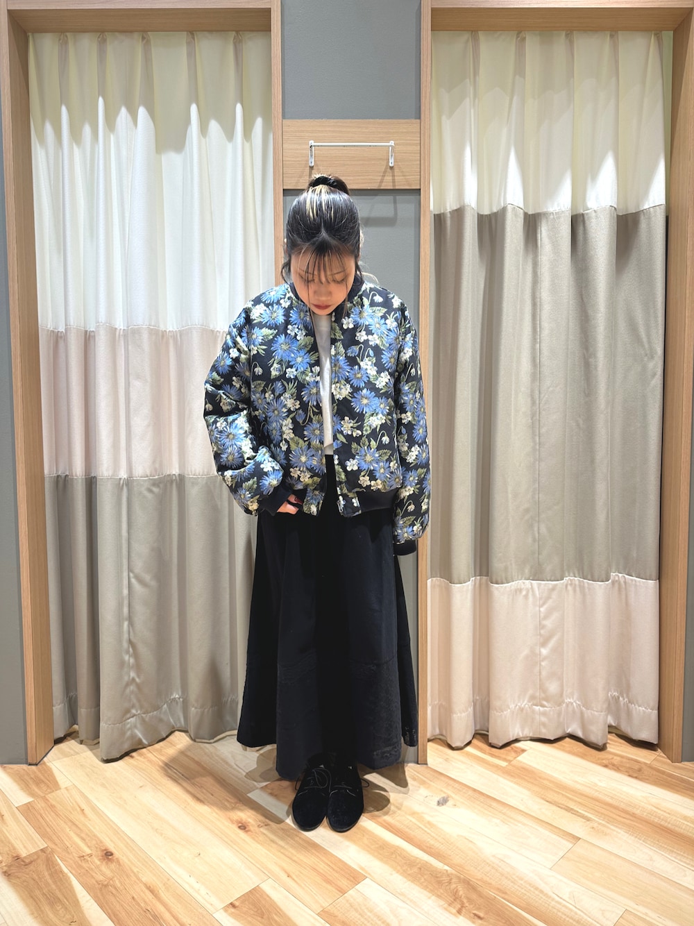カジュアルコーデ🤍💙🖤 花柄がキレイな中綿ブルゾン🫧 デザイン性抜群なので、1枚でオシャレ見え✨ 風を通しにくく、暖かいのでオススメ🌸 華やかな印象になります💐